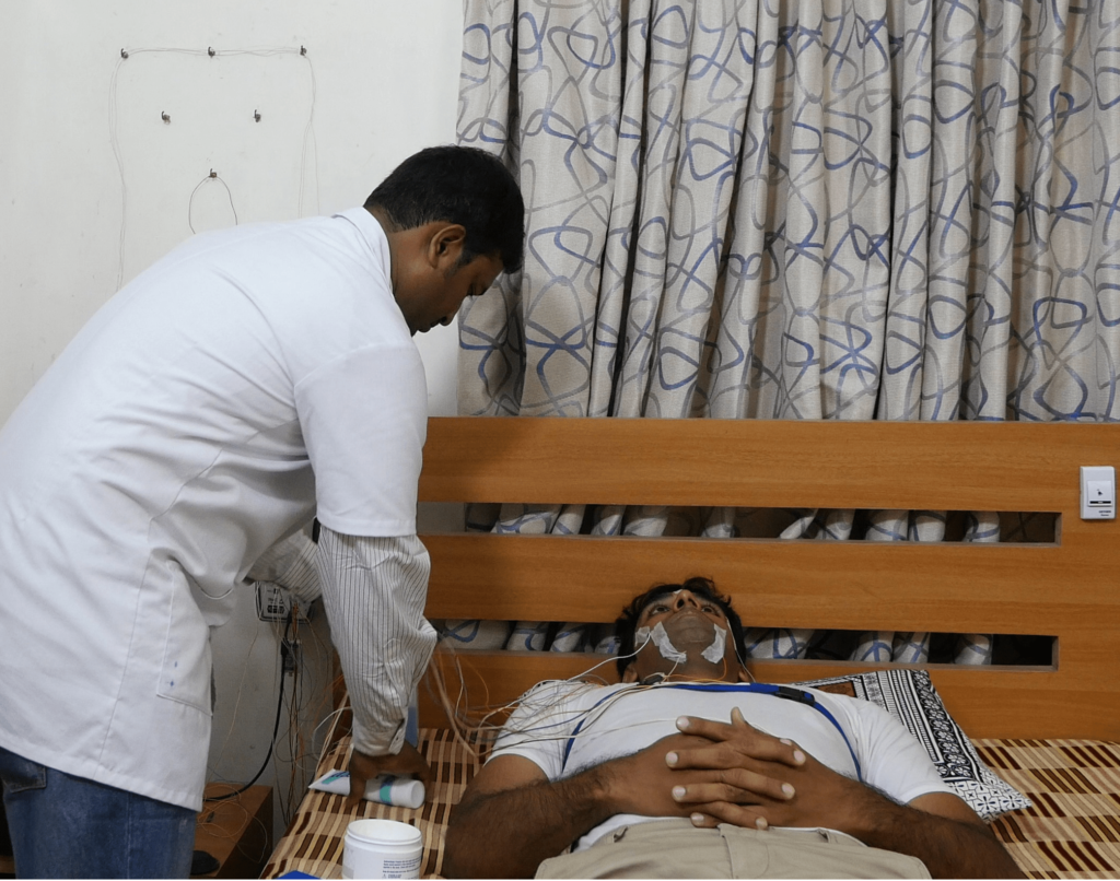 At Nithra, we conduct various types of sleep studies. A sleep study or polysomnography is a diagnostic procedure recording multiple parameters that identify different sleep stages and identify the nature and severity of the sleep problem. A trained sleep technician closely monitors all sleep studies at Nithra throughout the night and records the data. Subsequently, the studies are extensively analyzed through the process of ‘scoring’ and then interpreted by the sleep specialist, who plans treatment further based on the results.